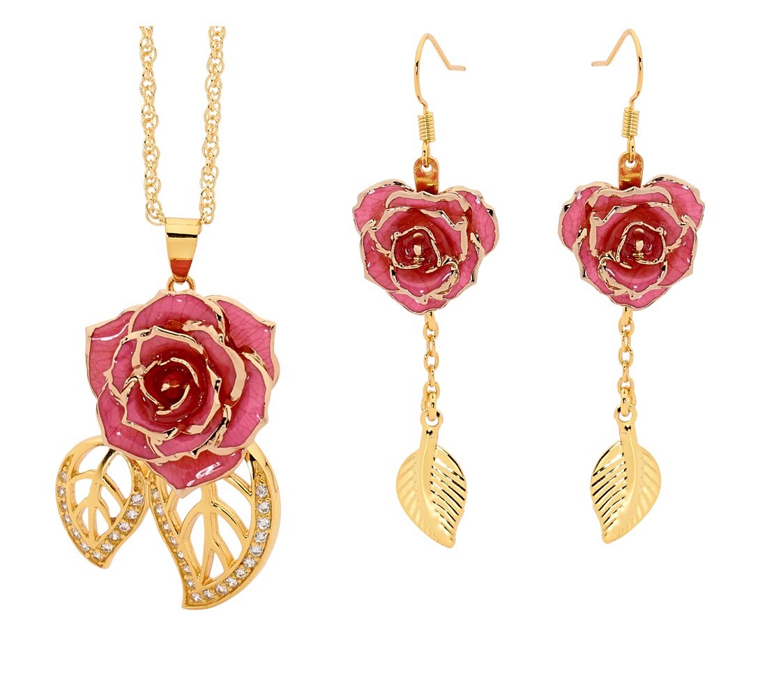 - A striking pendant, formed from real miniature pink rose petals that have been glazed and then trimmed using 24K gold. A multi-link gold-dipped chain comes supplied. The pendant's rose head measures 3/4” in diameter and the design features two attractive leaf figurines that are plated in 24K gold and decorated with 30 radiant synthetic diamonds.