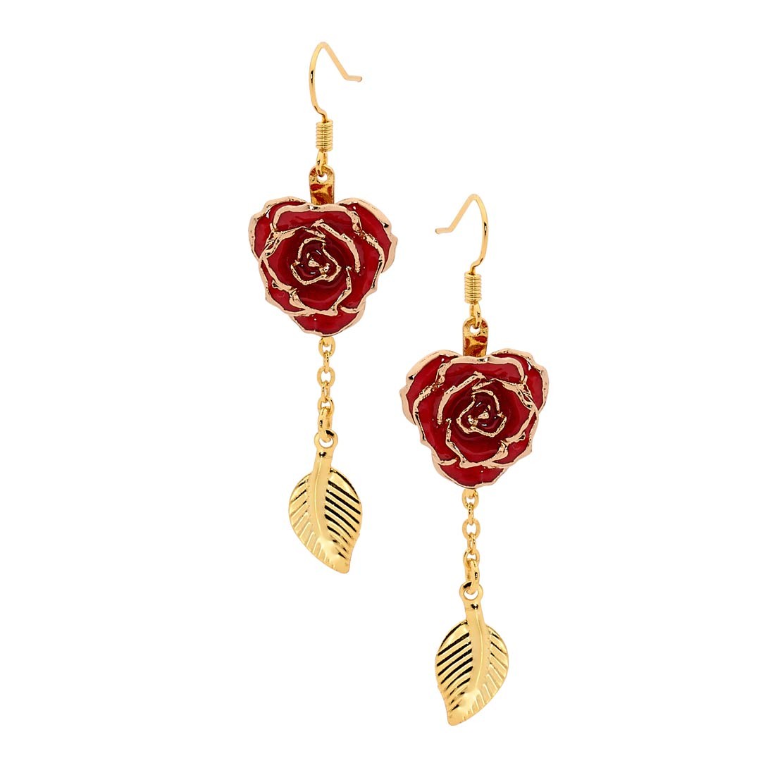 - A pair of chic drop earrings that feature matching natural 5/8" diameter miniature red rose heads that have been intricately glazed and trimmed with pure 24 karat gold. Including the beautiful gold-dipped leaf figurine, the total length of the earring drop is 1 1/4".