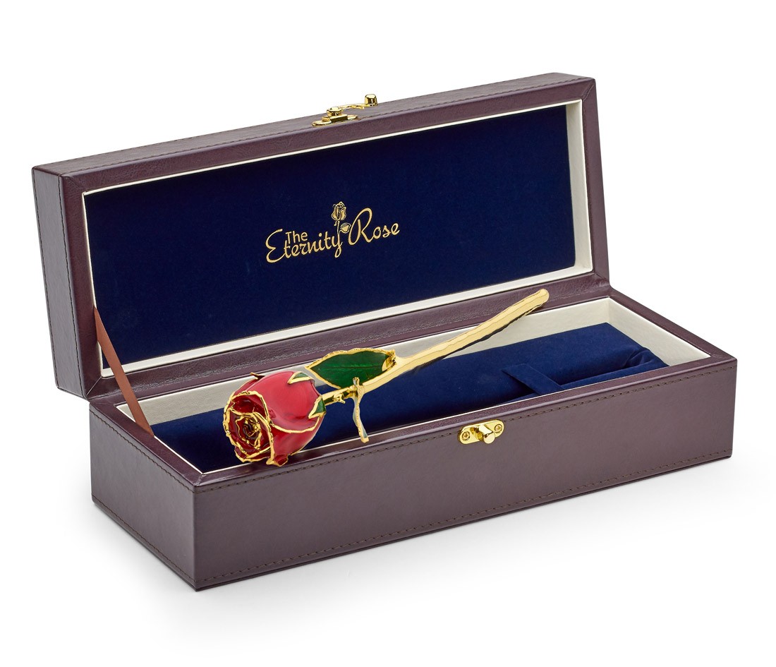 - A perfectly preserved and glazed natural red rose featuring pure 24 karat gold trimming. The leaves are 24 karat gold and glazed lattice, and the rose head and stem total around 12" in length.