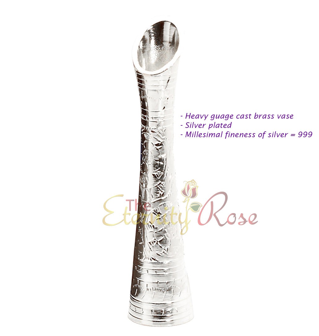 - A genuine rose, hand-picked at its point of perfection, combined with a silver-dipped cast brass vase.